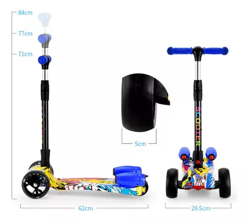CARACTERÍSTICAS:-Plegable, fácil de guardar y llevar-Ideal para niños de 3 hasta 10 años aproximadamente-Manillar graduable fácilmente-Tiene luces led en las ruedas delanteras-Con turbinas de humo-Bluetooth para poner la música que quieras desde tu celular-Con luces en las turbinas-Llantas en goma PU Wheel (Poliuretano)-Dimensiones aproximadas: 78 x 62 x 29-Altura del manubrio ajustable (60cm – 66cm – 72cm – 78cm)-Peso del producto: 4.5 kg-Capacidad máxima recomendada: 50 kg-Freno de pie en la llanta trasera-Tiene 3 sonidos incorporados-Se puede recargar o usar con pilas-Incluye cable usb Lo que obtienes con tu compra:1-Patineta Humo Scooter Niños Bluetooth Música Luces Recargable1-Cable USBGarantía por defectos de fabrica.